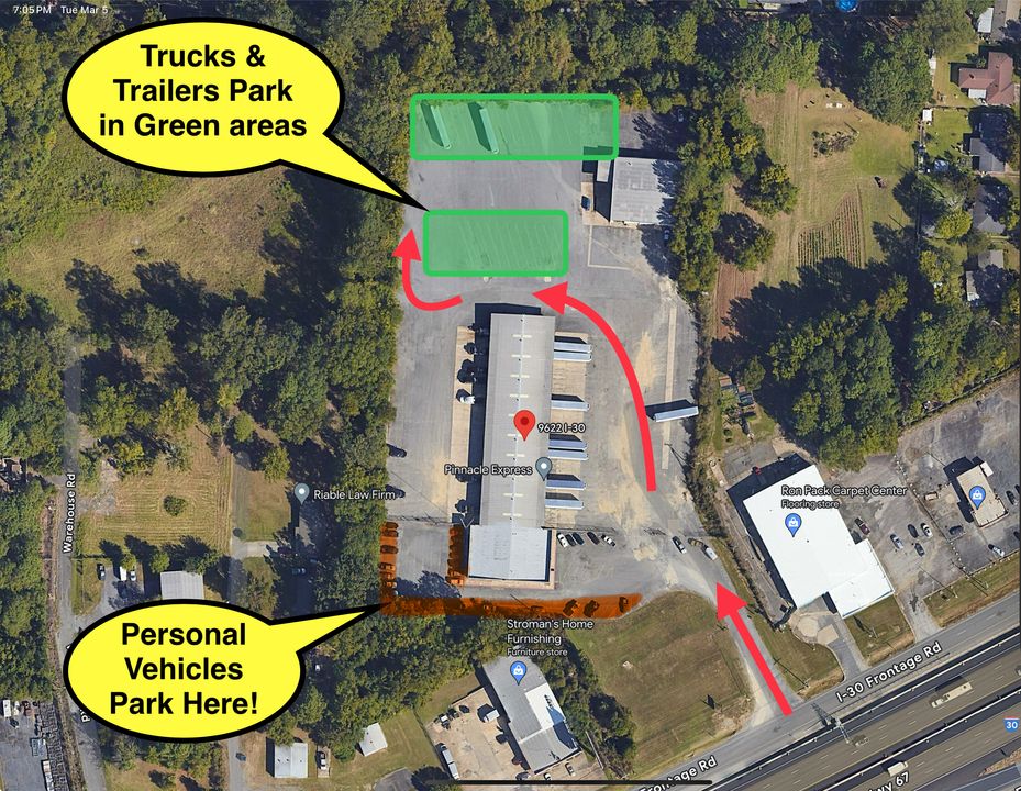 Eight acres paved, 24/7 access, cameras on property, drivers lounge, bathrooms, and on site shop available for minor repairs 7am - 5pm Mon - Fri  . Located just off I-30(Exit 131).  Shooters Sports Bar and Grill is just up the Street and there are Several other Restaurants and Hotels in the Area.  Walmart is 1.5 miles South West.  Monthly Drivers leaving personal vehicles Must park them in the Designated spot marked in the Aerial photo.